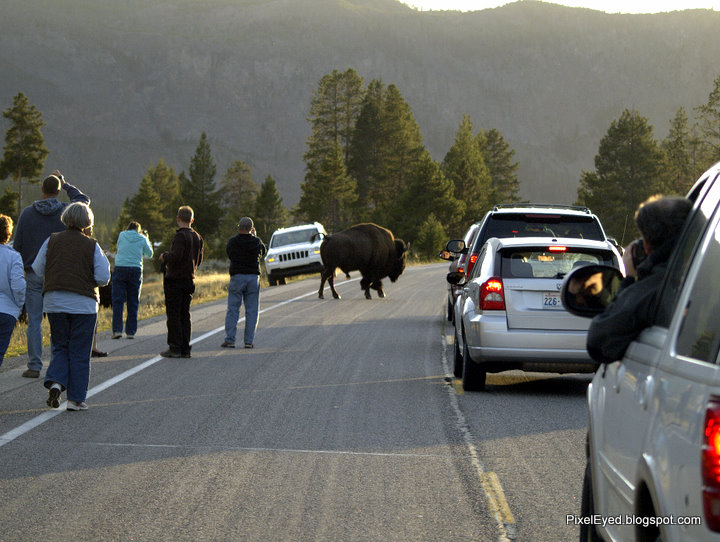 Don't get out of your car to get close to wildlife near a road, the park rangers tell you at Yellowstone Park where this was taken. Still, people do it all the time. The buffalo looks calm and peacefule moving across the road, but apparently they can get riled easily. If they do get riled, they can put up such a tantrum that a car can be the loser.
