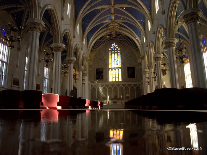 Looking out from a baptismal font in a church into which we wandered in Washington D.C. The sun had found a trio of windows it could blaze through and was adding real ambience to the scene. It's nice to have a production assistant like that when your shooting photos.